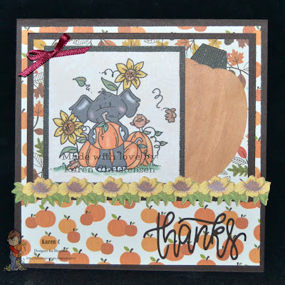 For this card I used the image called Edward Fall Pumpkin. I colored the image using Paint 3-D. The pumpkin and the sentiment were cut using the Cricut. The flower strip is from a punchout pad.
